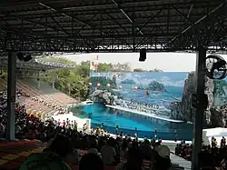 Beside the sea lion show theatre is an exhibit for Malayan tapirs. Other animals in the park's collection include capybaras, African porcupines, leopards, walruses, green iguanas, African spurred tortoises, Burmese pythons, nyalas, Dromedary camels, mandrills, pygmy hippopotamuses, freshwater stingrays, Red-shanked douc langurs, Black-and-white Colobus monkeys, binturongs, meerkats, toco toucans and raccoons. A very large exhibit housing a very large group of siamese crocodiles is also there with separate exhibits for false gharials and a giant saltwater crocodile. Large aquariums for exotic freshwater fish, such as arapaima and Mekong giant catfish are spread throughout the park. A large lake in which visitors can rent paddle-boats is filled with mute swans and black swans.[4]