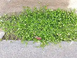Sagina (like Colobanthus called "pearlworts") is a genus of 20–30 species of flowering plants in the family Caryophyllaceae. These are flowering herbs native to temperate regions of the Northern Hemisphere extending south to tropical mountain areas at high altitudes, reaching just south of the equator in Africa. They are small annual or perennial herbaceous plants, growing to 5–15 cm. The leaves are opposite, often in tight whorl-like clusters, simple linear, typically 5–20 mm long. The flowers are solitary or in small cymes, with four or five green sepals and an equal number of white petals; the petal size relative to the sepal size is useful in species identification. The fruit is a small capsule containing several seeds.[2][3][4][5]