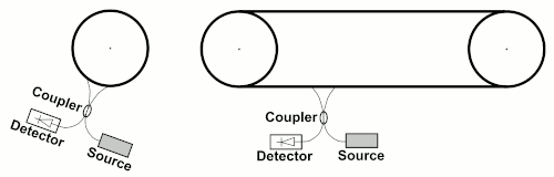 Figure 5. Conceptually, a conventional fibre optic gyro (FOG), shown on the left, can be divided into two semicircular sections with extended fibre connecting the end sections as shown on the right, creating a fibre optic conveyor (FOC).