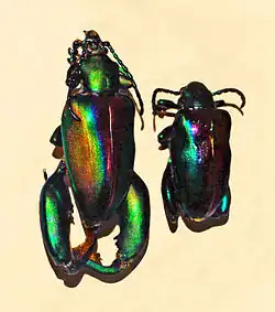 S. buqueti can reach a length of 25–50 mm (0.98–1.97 in).[1] These iridescent, colorful beetles have a striking sexual dimorphism. The males are much larger and have very long and strong hind legs (hence the common name frog beetle). The basic color is metallic green, with reddish and golden reflections on the elytra. Cocoons of this species can be found in the jungle on climbing vines, specifically kudzu. They have also been captive reared at the Berlin Zoo on sweet potato.[2]