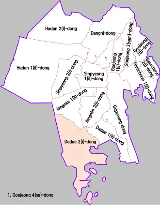 Saha District is divided into 8 legal dong, which all together comprise 16 administrative dong, as follows: