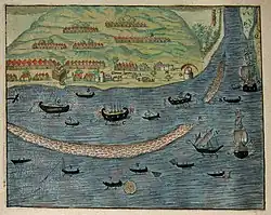 The Spanish governor in the Philippines, Santiago de Vera, tried to strengthen the Iberian positions in Maluku after Babullah's demise. A small fleet of four frigates under Pedro Sarmiento was dispatched from Manila in 1584 and forced the Ternatan dependency Moti Island to submit temporarily with the help of the Tidorese allies. Three frigates were then dispatched to the Bacan Islands to take in foodstuff. However, Kaicili Tolu met them in a sea battle where one frigate exploded as a vat of gunpowder was lit, and the others withdrew to Tidore. In the next year 1585 a larger Spanish fleet appeared in Maluku, driven by fear that the English might try to establish a post in the Spice Islands. Saidi was requested to give up the formerly Portuguese fort on Ternate, but gave a vague answer. Supported by the rulers of Tidore, Bacan and northern Sulawesi, the Iberian forces invaded Ternate. The defenders, reinforced by the crews of 30 Javanese merchant vessels, successfully defeated an attempt to storm the fortress. The Spanish commander Juan de Morones was forced to give up the enterprise and shortly returned to Manila.[9] A new expedition with 2,000 Spanish and Filipino soldiers was dispatched in 1593 but faltered due to a mutiny among the Chinese rowers. A few years later Saidi went on the offensive, sending a strong fleet of korakoras (large outriggers) to Mindanao which was loosely claimed by Ternate. They joined local rebels and Malay raiders to fight the Spaniards, but were eventually expelled in 1596.[10]