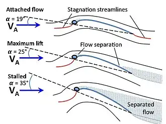 A sail provides propulsive force via a combination of lift and drag, depending on its angle of attack, its angle with respect to the apparent wind. Apparent wind is the air velocity experienced on the moving craft and is the combined effect of the true wind velocity with the velocity of the sailing craft. Angle of attack is often constrained by the sailing craft's orientation to the wind or point of sail. On points of sail where it is possible to align the leading edge of the sail with the apparent wind, the sail may act as an airfoil, generating propulsive force as air passes along its surface, just as an airplane wing generates lift, which predominates over aerodynamic drag retarding forward motion. The more that the angle of attack diverges from the apparent wind as a sailing craft turns downwind, the more drag increases and lift decreases as propulsive forces, until a sail going downwind is predominated by drag forces. Sails are unable to generate propulsive force if they are aligned too closely to the wind.