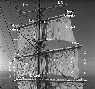 - Adjusting angle to the wind – Braces adjust the fore and aft angle of a yard (i.e. to rotate the yard laterally, fore and aft, around the mast).[57] Sheets attach to the clew to control the sail's angle to the wind.[57] Tacks haul the clew of a square sail forward.[57]