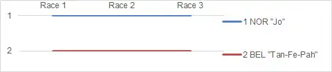 | Rank | Country | Helmsman | Crew | Boat | Race 1 | Race 2 | Race 3 | Total | |||
