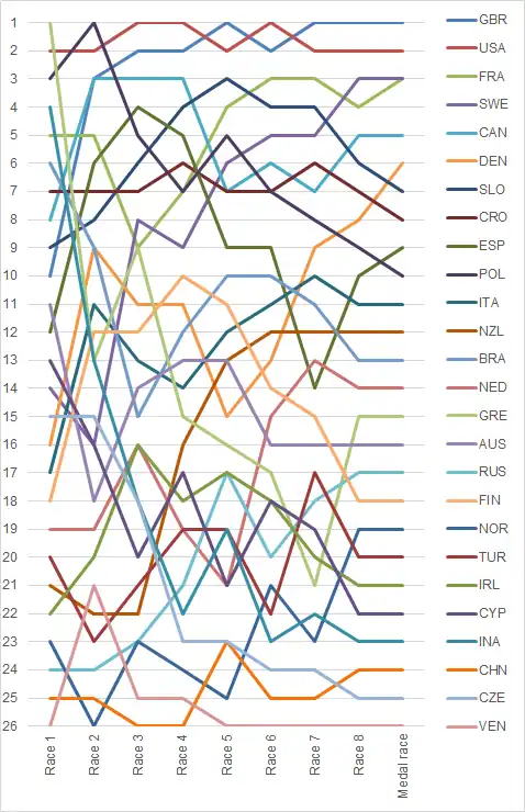 - ^ For the medal race the top ten boats qualified. Each position scored double points. All medal races were sailed on course area Yellow in front of the Qingdao International Sailing Centre.