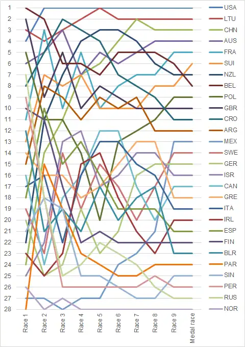 | ● | Practice race | ● | Race on Yellow | ● | Race on Green | ● | Medal race on Yellow |