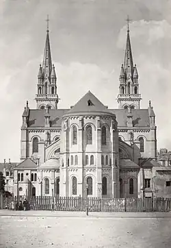 The church was built in an eclectic style, sometimes termed Second Empire style, which combined Neo-Romanesque elements with those of the Neo-Gothic style. A similar example of the style is the Abbey of Saint-Etienne, Caen, which joined two Romanesque-style towers with Gothic spires.[8]