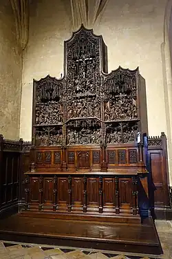 The Chapel of the Compassion, accessed from the ambulatory, was the former royal chapel. It contains one of the most notable works of art in the church, a Flemish carved retable made in about 1515 in Antwerp, near the end of the Middle Ages, when Flanders was at its artistic height. The carved sculpture represents scenes from the Old and New Testament, and figures from all ranks of society, from kings and nobles to soldiers and peasants in traditional Flemish costume. The central compartment depicts a Tree of Jesse, illustrating the genealogy of Christ.[11]