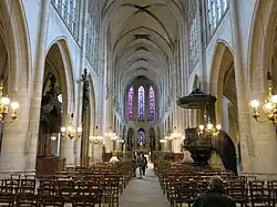 The church has a long central nave, built in the 15th century,[6] a choir, a transept, and aisles along the nave. Numerous chapels line the aisles, each decorated with paintings and sculptures. Much of the decor comes from the time of Louis XIV, and the interior is lighter and brighter than in Gothic churches. Neoclassical upper windows provide additional light, and are primarily made with clear glass.[7]