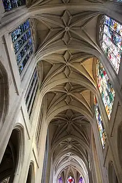 The nave of the church (1600–1620) is notable for its dramatic height and the simplicity and purity of its lines. While the lower level of the nave is late gothic, the upper level of the nave shows the influence of the Renaissance, with large semi-circular arches containing a series of large stained glass windows, filling the church with light. The upper windows are 21st-century, by Claude Courageux, illustrating the story of Adam and Eve, Noah's ark, and the patriarchs and their spouses. The ceiling of the nave, where the arches of the walls come together in an elaborate embroidery, symbolizes the vaults of heaven.