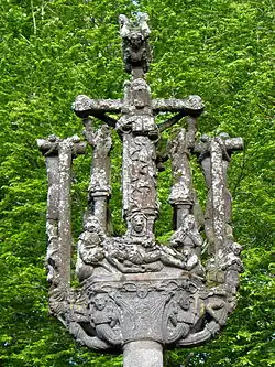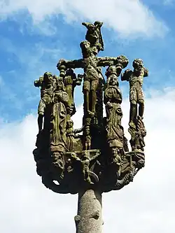 All the Calvary's sculptures are grouped at the top of the cross' shaft. After the black death outbreaks of the 15th and 17th century, depictions of "bubons" were added to the shafts of the three crosses to ward off this dreadful disease. Bubons were the boil like sores which were one of the symptoms of the plague.[7] The calvary dates to 1575 and is inscribed "Cest croix fut faicte l'an 1575 Mathieu Cravec PG". It bears the coats of arms of Kerlech Chastel and of Rusquec.[2]