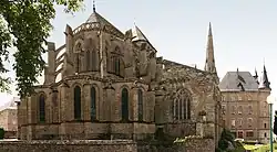 The chevet consists of three straight bays, followed by a five-sided apse, all surrounded by an ambulatory with five radiating chapels. On either side of the first bays of the ambulatory, two three-bay aisles house rectangular chapels. The entire structure is vaulted with quadripartite ribs. The width of the straight bays of the choir decreases as one moves toward the apse, which suggests that the Gothic building was likely constructed on the foundations of the Romanesque church.[5]