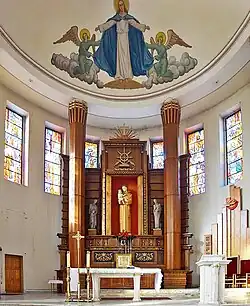 From 1964 and 1972, several stained glass windows were installed in the chancel and along the side aisles. Between 1972 and 1984, new furniture, decoration and equipment were procured: pews, confessionalss, lighting, flooring, heating, a figure of the Sacred Heart of Jesus as well as paintings.