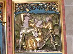 There are 52 known images of her in various English churches that survived the ravages of the 16th-century Commissioners. These are concentrated in Devon and East Anglia. Most of these images are on the panels of rood screens or featured in stained glass with only one being a stone capital (Stokeinteignhead, Devon). She is also depicted in a tapestry of circa 1499 at St. Mary's Guildhall, Coventry.