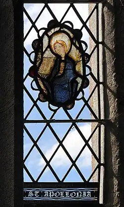 Saint Apollonia (Greek: Ἁγία Ἀπολλωνία; Coptic: Ϯⲁⲅⲓⲁ Ⲁⲡⲟⲗⲗⲟⲛⲓⲁ, pronounced[tiˈaɡiəʔa.pɔlˈlo.ni.jə]) was one of a group of virgin martyrs who suffered in Alexandria during a local uprising against the Christians prior to the persecution of Decius. According to church tradition, her torture included having all of her teeth violently pulled out or shattered. For this reason, she is popularly regarded as the patroness of dentistry and those suffering from toothache or other dental problems. French court painter Jehan Fouquet painted the scene of St. Apollonia's torture in The Martyrdom of St. Apollonia.[1]