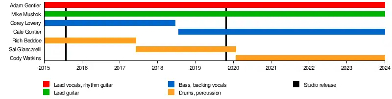On June 5, 2017, drummer Rich Beddoe confirmed that he had left Saint Asonia on good terms to do other things.[15] On July 12, 2017, the band played their first show with Mike Mushok's former Staind bandmate Sal Giancarelli on drums. Lowery departed the band during the summer of 2018 to join Seether full-time and was replaced by Art of Dying bassist and Gontier's cousin Cale Gontier.[16]