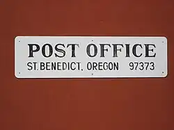 When it moved from Gervais to the town of Mt. Angel in 1884, the postal service would not allow the abbey to establish its own post office as it was less than a mile from the Mount Angel post office.[1] A new abbey was completed on the top of nearby Mount Angel butte in 1903, and Saint Benedict post office was established there in 1914.[1] Mount Angel Abbey was originally named Saint Benedict's Abbey, which in turn was named for Benedict of Nursia, the founder of the Order of Saint Benedict.[1] The ZIP code of the post office is 97373.