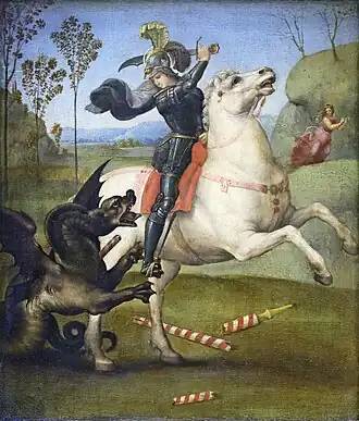The Saint George has sometimes been ascribed to the artist's Roman period, because the horse resembles one of the horses of Monte Cavallo (the Quirinal Palace). However, Raphael could easily have known this particular horse from a drawing of it, done by one of Leonardo's pupils.[3] To judge by the still somewhat naïve and Peruginesque style of the painting, it is really one of Raphael's early works, dating from about 1504. He produced another painting of the same subject a little later (the aforementioned panel in Washington D.C.), and towards the end of his life he painted a large Saint Michael which is also in the Louvre.