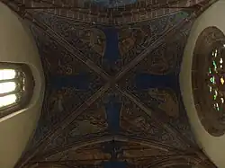 The presbytery has two vault fields and a five-sided apse, which is recognisable from outside, thank to supporting pillars. There are ten pillars, eight of them made mostly of sandstone blocks, each finished with a small gable roof. There are eight pointed arch shaped windows into the presbytery. Three of them are in the longitudinal walls together with a rosette window. Architect Kamil Hilbert modified them, he reopened windows which had been cancelled during the Baroque adaptation of the church. He rebuilt an original jambs with a double groove and a divided pear shaped shaft. Window traceries consist of trefoils, quatrefoils, five-pointed and six-pointed stars and a rose. Under the roof alongside the presbytery runs the crown cornice with a simple groove. Kamil Hilbert also built a new rib vault in both fields of the presbytery and in the apse. Big ribs uses remains of Tas-de-charges, original springings and corbels. Corbels are designed as a plant plastic ornament. A crossing arch separating the nave from the choir is formed by a wide rectangular strip running continuously to the ground. There is also a pear shaped profile running with the rectangular strip. Its pear shaped capitals have similar character as those in the presbytery. Keystones of the vault are decorated with symbols of Adam and Eve, music and a sign of the town with the year of the vault reconstruction, in the centre.