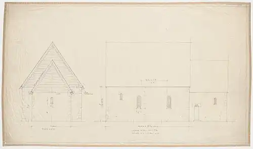 The earliest existing historical records of the old stone church date back to 1403, but the church wasn't new at that time. The first church in Vanylven was a stone long church that was likely built around the year 1150. It was called Vanylven Church originally. The medieval church had a rectangular nave that measured 11.7 by 8.2 metres (38 ft × 27 ft) and narrower, square chancel that measured about 5.6 by 5.6 metres (18 ft × 18 ft). During the 1600s or early 1700s, the nave was enlarged with a timber-framed addition on the west end of the building.[3][4][5]
