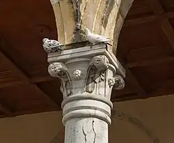 Kostas Lassithiotakis notes that medieval Italian churches rarely sported porticos and based on the Renaissance style of Saint Mark's portico, it cannot be dated to the original construction of the church, but rather it was added much later.[22] The loggia was used by merchants who sold grain on counters. During the Ottoman period the flat roof was removed and a pitched roof was added, which rested directly on the columns. Of the original columns, only three survive, with their capitals dating to around the fourteenth century.[8]