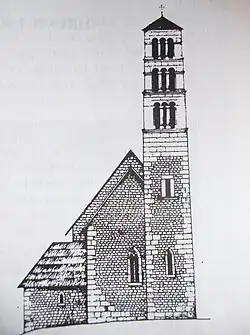 The building has undergone a series of redesigns, which makes difficult establishing its age and the original appearance with certainty. It is assumed that the church was first built as a simple Romanesque-style basilica in the 12th century.[1] It had deteriorated significantly by the end of the 14th century, when it was restored and dedicated to the Blessed Virgin Mary. It is not clear who commissioned the restoration of the building; circumstantial evidence points to either the Franciscans who had settled in the area or, somewhat less likely, to Hrvoje Vukčić Hrvatinić, the Kingdom of Bosnia's leading magnate and founder of the city of Jajce.[2]
