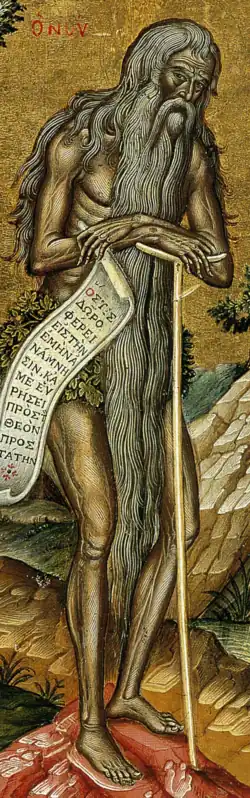 Saint Onuphrius lived in seclusion in the desert of Upper Egypt. He was from Ethiopia. The name Onuphrius is a Hellenized version of the Coptic name Unnufer from the Egyptian word wnn-nfr meaning the perfect one.[3] He was a monk near Thebes. He studied law and philosophy before becoming a monk. He eventually left the monastery and lived in the desert for over sixty years. The only visitor he had to his monastic cell was an angel who delivered sacred bread every night. He also ate dates from desert palm trees. During his final days on earth, he was visited by a man named Paphnutius.[4]