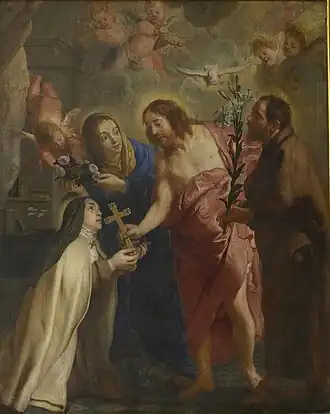 In the southern cross-arm, also known as the Saint Quentin's choir, two Baroque altars were installed. The southern altar holds the painting The torture of Saint Quentin by Pieter-Jozef Verhaghen (1758, after original by Gaspar de Crayer). The northern altar holds The vision of Theresia of Avila attributed to Gaspar de Crayer, which was transferred from the monastery of the Discalced Carmelites. A late eighteenth-century confessional seat is erected against the south wall. The southern altar contains a 17th-century tabernacle in ebony and turtle leather, also from the monastery of the Discalced Carmelites, in the Northern Cross-arm or Our Lady's Choir. The central painting with Saint Anna surrounded by plague saints is by Gaspar de Crayer (1618). The other altar in the northern transept contains an image of Mary with child on the globe (17th century).[1] Against the northern wall of the northern cross-arm is a seventeenth-century confessional. The church also has a Last supper dated 1521 by the Leuven city painter Jan Willems, which is executed in a Renaissance style.[5] Other paintings in the church include The entombment of Christ by Jan van den Hoecke, a Christ healing the lame at the pool of Bethesda by Artus Wolffort and several more works by Pieter-Jozef Verhaghen, Jan Jozef Verhaghen and anonymous painters. The church also houses a sculpture of Saint Quentin by Artus Quellinus the Elder and another of a Virgin and Child attributed to the same artist.[6]