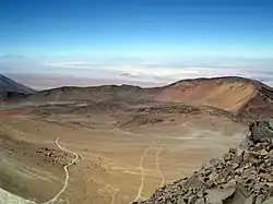 The caldera is bounded by cliffs reaching a height of 400 metres (1,300 ft), which are buried by lava flows from Sairecabur on the northern rim; one of these lava flows reaches the caldera bottom.[30] The pre-collapse volcano was about 7,000 metres (23,000 ft) high and would have been one of the highest volcanoes in the world; Ojos del Salado reaches an altitude of 6,885 metres (22,589 ft).[31] Sairecabur proper has three cones.[30] Thick (10 metres (33 ft)) and short lava flows emanated from the northern cone. Glacial erosion has affected Sairecabur and moraines cover some lava flows south of Sairecabur.[31] The total volume of the Sairecabur proper is about 35 cubic kilometres (8.4 cu mi).[12]