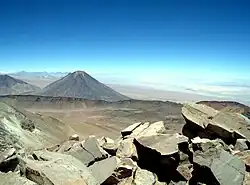Sairecabur is part of the Andean Central Volcanic Zone (CVZ).[5] A number of stratovolcanoes can be found in the area, many of which were affected by explosive eruptions that have destroyed parts of their edifices.[6] Effusion of large amounts of lava took place from several cones. Many volcanoes are extinct and only a few have documented activity.[7] The geologist Juan Brüggen in 1950 estimated that there were about 800 volcanoes in northern Chile, about 37 of them east of the Salar de Atacama. Also part of the volcanism are large ignimbrites, which are usually thought to be of Miocene age.[8] Those in the area of Sairecabur often originated in the neighbourhood to the conical volcanoes.[9] The volcanoes formed over crust with thicknesses reaching 70 km (43 mi), thus the erupted magmas are heavily influenced by the crust.[10] A number of the highest stratovolcanoes in the world are in the CVZ. Historical activity has been low in comparison to the volcanic zones of southern Chile and Colombia/Ecuador. In Chile, much of the area of the CVZ is desert and thus difficult to research.[11]