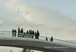 From 2004 to 2011, a group of Georgian and German scientists carried out large-scale investigations and dated the site to the early 3rd millennium BC or to the second half of the 4th millennium, suggesting that Sakdrisi might be one of the world's oldest known gold mines.[3] In 2013, the government of Georgia deprived the site of a cultural monument status, which had been conferred on it in 2006, and gave permission to the mining company RMG to extract gold in the wider area where Sakdrisi is located, sparking protests from academics and preservationists.[1][4][5][6] RMG launched its works until December 2014, leading to more protests from the political opposition parties and preservationists. It was also condemned by the Georgian Orthodox Church and disapproved by President Giorgi Margvelashvili, but defended by Prime Minister Irakli Garibashvili. On 25 December 2014, the Parliament of Georgia approved a proposal to establish an ad hoc investigative parliamentary commission to probe into the developments around Sakdrisi,[7][8] but, on 4 March 2015, the ruling Georgian Dream coalition blocked the probe by refusing to vote for a composition of the commission.[9]