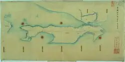 In an early colonization attempt, a Japanese settlement was established at Ōtomari on Sakhalin's southern end in 1679.[34] Cartographers of the Matsumae clan drew a map of the island and called it "Kita-Ezo" (Northern Ezo, Ezo being the old Japanese name for the islands north of Honshu).