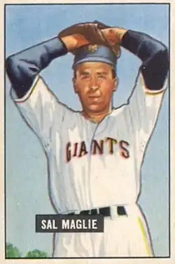 Salvatore Anthony Maglie (April 26, 1917 – December 28, 1992) was an American Major League Baseball pitcher and later, a scout and a pitching coach. He played from 1945 to 1958 for the New York Giants, Cleveland Indians, Brooklyn Dodgers, New York Yankees, and St. Louis Cardinals. Maglie was known as "Sal the Barber", because he gave close shaves—that is, pitched inside to hitters. A gentle personality off the field went unnoticed during games, his foreboding physical appearance contributing to his menacing presence on a pitcher's mound. He was the last of 14 players to play for the Giants, Dodgers and Yankees at a time when all three teams were in New York City. During a 10-year major league baseball career, Maglie compiled 119 wins, 862 strikeouts, and a 3.15 earned run average.[1]