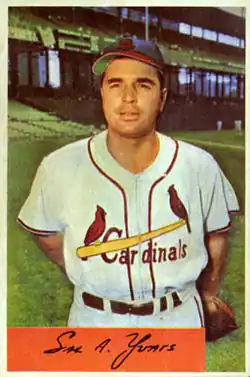 Salvador Anthony Yvars (February 20, 1924 – December 10, 2008) was an American professional baseball catcher. He played all or part of eight seasons in Major League Baseball, with the New York Giants from 1947 to 1953 and the St. Louis Cardinals from 1953 to 1954. Born in Manhattan's Little Italy to a Valencian gravedigger and a Sicilian laundress,[1] he was a three-sport star at White Plains High School, playing football, basketball, and baseball.[2] He originally signed with the Giants in 1942, and enlisted in the United States Army Air Forces shortly afterward.[2] During his time in the Army, Yvars was effectively a test dummy, with him saying of his ability to handle the tests, "I could take six and a half G's without a pressure helmet."[2]
