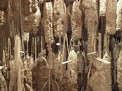Hungarian-type salami is a specialty in salami production, because it is first slightly smoked and mold-ripened afterward.[24] Szegedi téliszalámi, a Hungarian winter salami, is made of raw pork, bacon, salt, spices, sugars, and sodium nitrite.[24] The Mangalitsa pork breed, with equine large intestine used as its casing to preserve and serve it.[28] This type acquires a grey mold cover on it and has a firm texture and excellent keeping quality after a 30% weight loss reached in 3 to 4 months.[28]