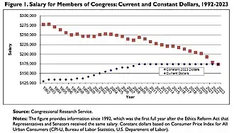 This chart shows historical information on the salaries that members of the United States Congress have been paid.[1] The Government Ethics Reform Act of 1989 provides for an automatic increase in salary each year as a cost of living adjustment that reflects the employment cost index.[2] Since 2010 Congress has annually voted not to accept the increase, keeping it at the same nominal amount since 2009. The Twenty-seventh Amendment to the United States Constitution, ratified in 1992, prohibits any law affecting compensation from taking effect until after the next election.