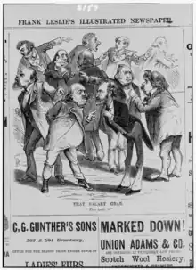 - ^ The image depicts a well-dressed man at center, looking down on an impoverished man holding an itemized list labeled "Monthly Expenses Clerk and Family" which shows that the man comes up $46.00 short each month, next to him on a chair is another itemized list labeled "Washington Price List" outlining the costs of various food items, lodging, and fuel. At left, Horace Greeley, who died several months before the "Salary Grab Act" came up in Congress, stands with his right hand raised and appears to be admonishing the man at center, holding a copy of the New-York Tribune in his left hand and papers in his coat pocket state "Bail for Jeff Davis—Universal Suffrage". At far left is a "Bill" on a table which reads, "66 2/3 pr. cent to Members of Congress on account of high prices in Washington". The U.S. Capitol building can be seen through a window.[4]