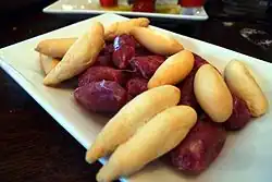 Salchichón is a Spanish summer sausage that is made by smoking, drying, cooking, or some combination.[1] It is made with pork, although some recipes use other meats including ox, veal, or horse.[1]