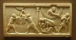 The Salerno Ivories are a collection of Biblical ivory plaques from around the 11th or 12th century that contain elements of Early Christian, Byzantine, and Islamic art as well as influences from Western Romanesque and Anglo-Saxon art.[1] Disputed in number, it is said there are between 38 and 70 plaques that comprise the collection.[2] It is among the few large unified sets of ivory carvings preserved from the pre-Gothic Middle Ages, together with the Charlemagne chessmen and some others.