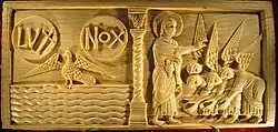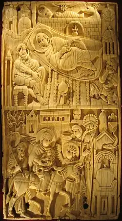It is disputed that there are between 38 and 70 figurative plaques, thirteen medallions, and seventeen border carving fragments.[2][8] The majority of the Salerno Ivory panels are well-preserved and in excellent condition.[3] They are carved in relief into flat segments of ivory. There are eighteen plaques that depict scenes from the Old Testament.[9][10] These plaques are on average 12 cm to 24 cm wide and about 9 cm tall, while many of the New Testament plaques average 24 cm tall and 12 cm wide.[3] Cornices and borders average from 21 to 25 cm long by about 7 cm wide.[11] The supporting columns are about 23 cm by 2 cm and the busts are 6 cm squared.[11] Most of the plaques are divided into an upper half and lower half and contain two separate scenes, with a few exceptions.[3][2] The plaques that depict the Old Testament are oriented horizontally, whereas the plaques that depict the New Testament are oriented vertically.[3]