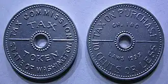 Sales tax tokens are fractional cent devices that were used to pay sales tax on very small purchases in many American states during the years of the Great Depression. They were created as a means for consumers to avoid being "overcharged" by having to pay a full penny tax on purchases of 5 or 10 cents. Issued by private firms, by municipalities, and by twelve state governments, sales tax tokens were generally issued in multiples of 1 mill (1⁄10 cent).[1]