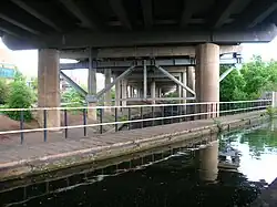 Salford Junction became a double junction on 14 February 1844 when the Grand Union Canal and Tame Valley Canal joined the Birmingham and Fazeley Canal.[1] Prior to this, the Birmingham and Fazeley Canal crossed the River Tame via a seven-arched aqueduct, each with a span of 18 feet.[2] T & S Element opened boatyards at Salford Bridge in 1932 which soon became the company's head office. Spencer, Abbott and Company owned a boatbuilding yard at the junction too, however traces of these companies no longer exist.[3]