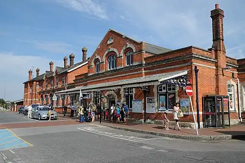 The approach road from the city is accessed from a junction on the south side of the railway bridge across Fisherton Street, which leads into a one-way car park with 287 spaces.[14] The large building on the right of the approach road is the old LSWR buildings of 1859, which now houses the Salisbury signal panel. Immediately next door is the red brick building of 1902, now the main entrance where the ticket office and buffet are located.[5]