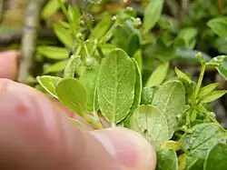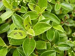 - Leaves usually ovate up to 5 cm long by 3 cm wide; hairless and bright green on upper side; at first densely hairy on lower side, then hairless; margins with numerous small blunt teeth.