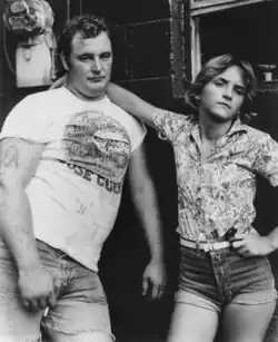 Referring to "Untitled", an image from the book shown here, Mann says that the young girl was extremely reluctant to stand closer to her mother's boyfriend. Mann said that she thought it was strange because "it was their peculiar familiarity that had provoked this photograph in the first place". Mann didn't want to crop out the girl's elbow but the girl refused to move in closer. According to Mann, several months later, the girl's mother shot her boyfriend in the face with a .22. In court the mother "testified that while she worked nights at a local truck stop he was ‘at home partying and harassing my daughter.'" Mann said "the child put it to me somewhat more directly". Mann says that she now looks at this photograph with "a jaggy chill of realization".[16]: 50