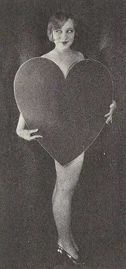 After the introduction of sound films, she became a dancer, known for the fan dance, which she popularized starting at the Paramount Club, at 15 E. Huron, in Chicago.[8] Her most famous appearance was at the 1933 Chicago World's Fair, known as the Century of Progress, accompanied by her backing orchestra, directed by Art Frasik. She would play peek-a-boo with her body by manipulating her fans in the front and behind her, like a winged bird as she swooped and twirled on the stage, usually to "Clair de Lune".[9] She was arrested four times in a single day during the fair due to perceived indecent exposure after a fan dance performance and while riding a white horse down the streets of Chicago, where the nudity was only an illusion,[10] and again after being bodypainted by Max Factor Sr. with his new makeup formulated for Hollywood films.[11] She was convicted of willfully performing an obscene and indecent dance in a public place on September 23, 1933 but was allowed to continue performing at World's Fair, and the conviction was overturned in November of 1934.[12]