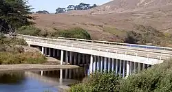 At least seven bridges span Salmon Creek. The newest and longest of these is the State Route 1 bridge, which is 200 feet (61 m) long and was built in 1983. Freestone Flat Road crosses on a steel truss 103 feet (31 m) long which was built in 1955, making it the oldest of the seven. Bodega Highway crosses in two places: 0.9 miles (1.4 km) from State Route 1 on a bridge 92 feet (28 m) long built in 1962 and at Valley Ford-Freestone Road on a 76 ft (23 m) bridge built in 1968. Salmon Creek Road spans the creek on a 78 ft (24 m) bridge dating from 1958, Bohemian Highway crosses on a 70 ft (21 m) bridge from 1971, and Scouts Camp Road crosses on a 57 ft (17 m) structure from 1960.[11]