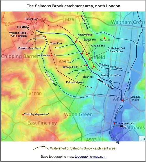 - ^ More information about the course of Salmons Brook, with images, can be found in Watson G, 2004-05, Lower Edmonton- Transport and Watercourses - Salmon's Brook, retrieved 7 February 2022.