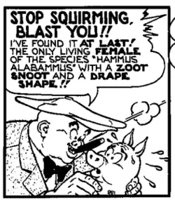 One story from 1942 concerned the kidnapping of Salomey by "the world's greatest sportsman hogbreeder" J. R. Fangsley, who wanted to breed her with the last male Hammus alabammus, "Boar Scarloff" (a pun on actor Boris Karloff). In 1947 Salomey was again kidnapped, this time by Bounder J. Roundheels, who wanted to use Salomey to create a unique dish that would gain him entrance into an exclusive Gourmets' Club. And in "Porknoy's Complaint" (1969), pork tycoon J. Roaringham Fatback desired her for his favorite dish—pork and beans "Buckingham Palace style".
